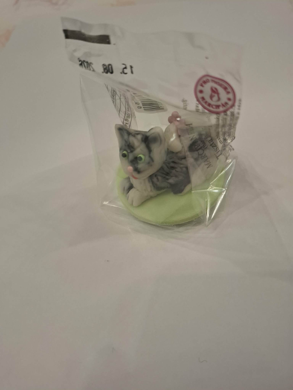 Szürke fekvő cica közepes kézműves marcipán figura, 35g