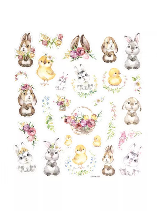 Matrica, húsvéti, nyuszik, csibék és virágok,15x17cm