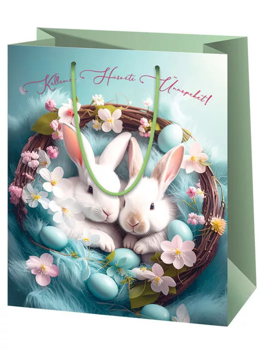 Húsvéti ajándéktáska 14x11x6cm, kicsi, kék, két nyuszi koszorúval