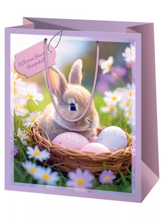 Húsvéti ajándéktáska 14x11x6cm, kicsi, lila, nyuszi tojásokkal egy kosárban